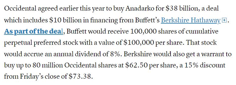 여기서 재미있는 부분입니다. 추가로 워렌트를 취득했는데 그 조건이 8000만 주의 옥시 주식을 62.5 달러에 살 수 있는 권리입니다. 이는 당시의 가격 73불 보다 15% 할인된 금액에 살 수 있는 좋은 조건입니다.
